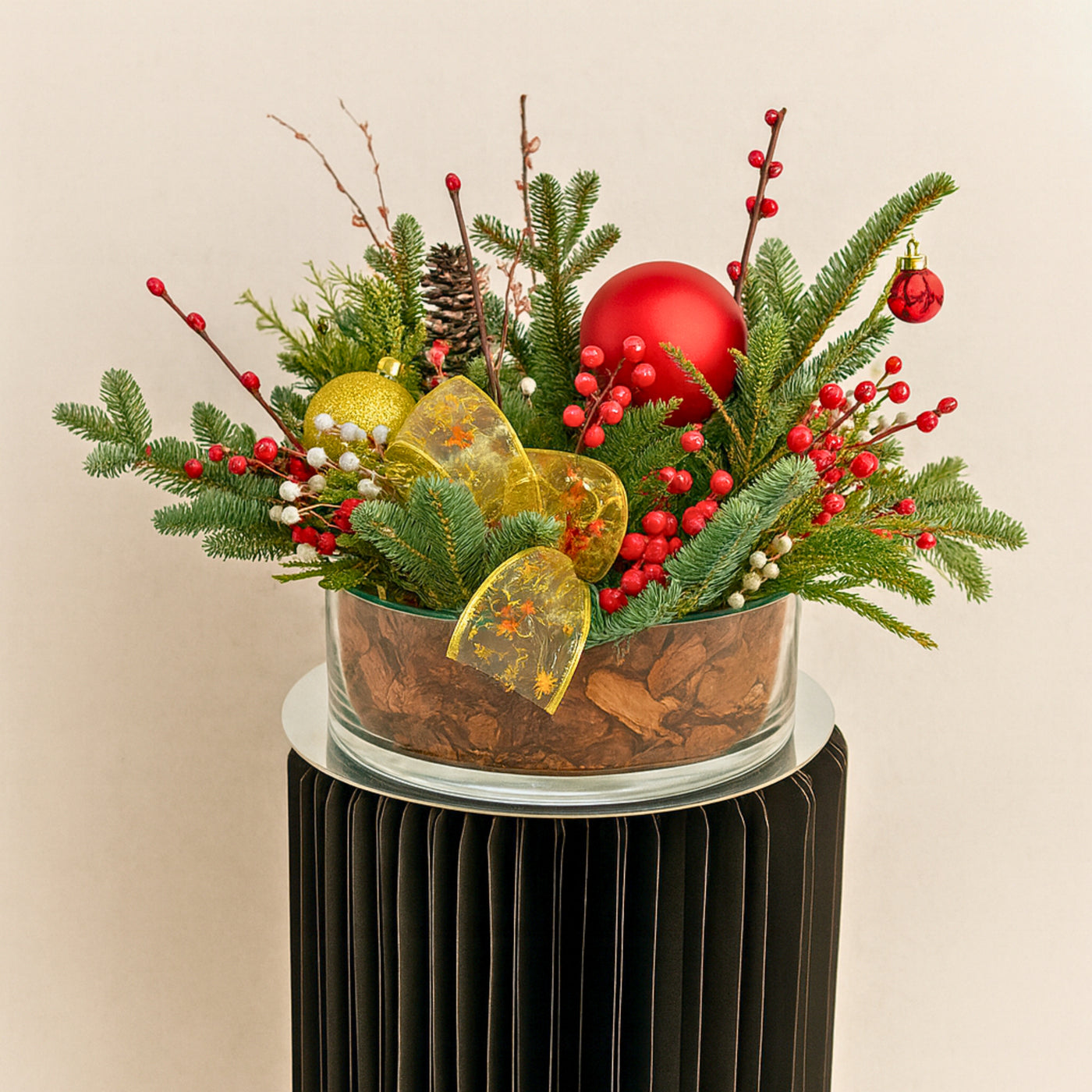 Add festive elegance to any space with this handcrafted Christmas table arrangement from We Flowers, beautifully designed with fresh winter greenery, red berries, pinecones, and sparkling gold and red ornaments. The composition blends natural textures with seasonal color, making this Christmas table arrangement from We Flowers a perfect choice for homes, cafés, hotels, and office décor during the holiday season.