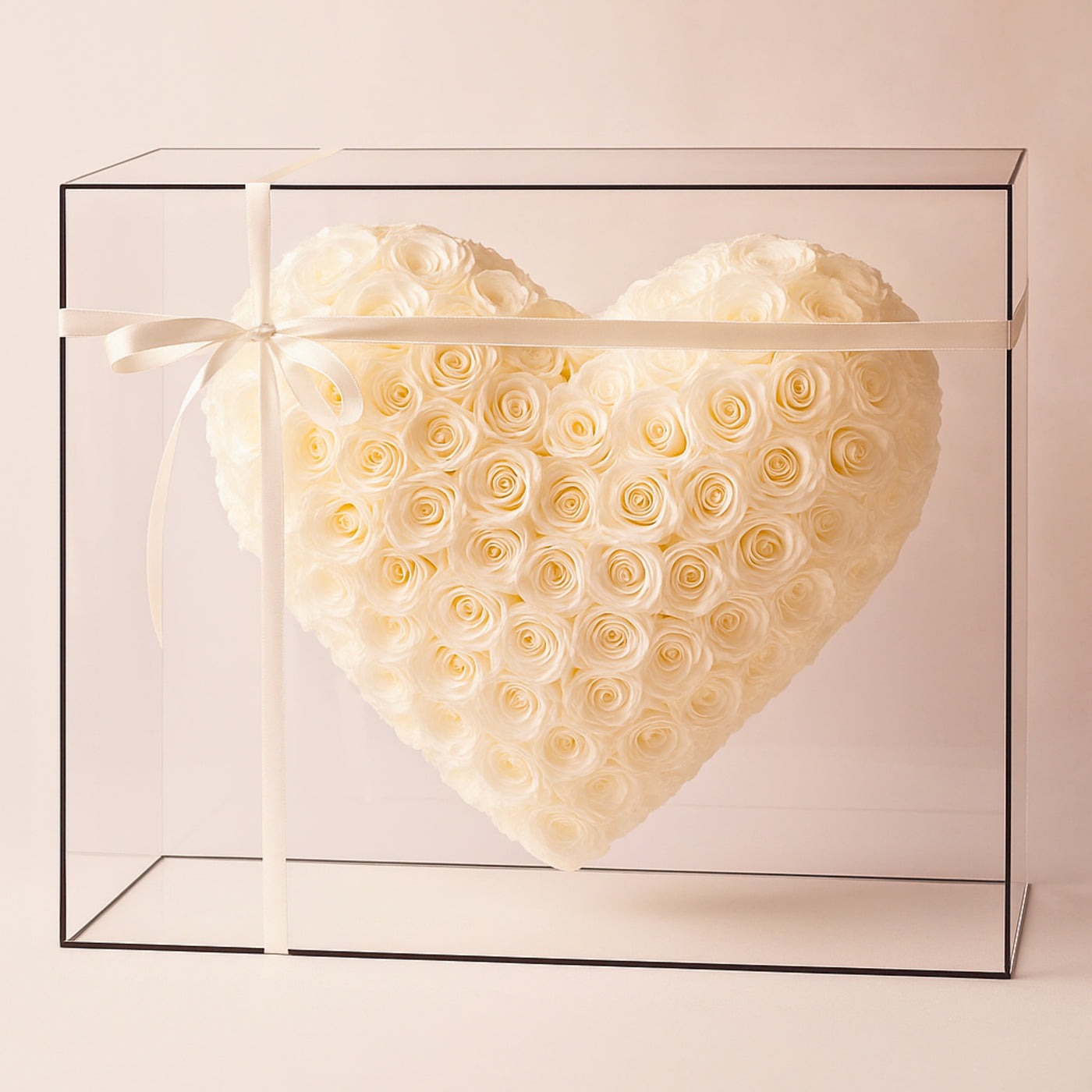 Discover the purity of timeless beauty with We Flowers’ White Heart Forever Rose Arrangement. This exquisite creation from We Flowers features preserved white roses gracefully shaped into a perfect heart, encased in a luxurious transparent acrylic box. Each rose is carefully selected for its flawless form and creamy ivory tone, reflecting the brand’s signature commitment to quality and elegance.