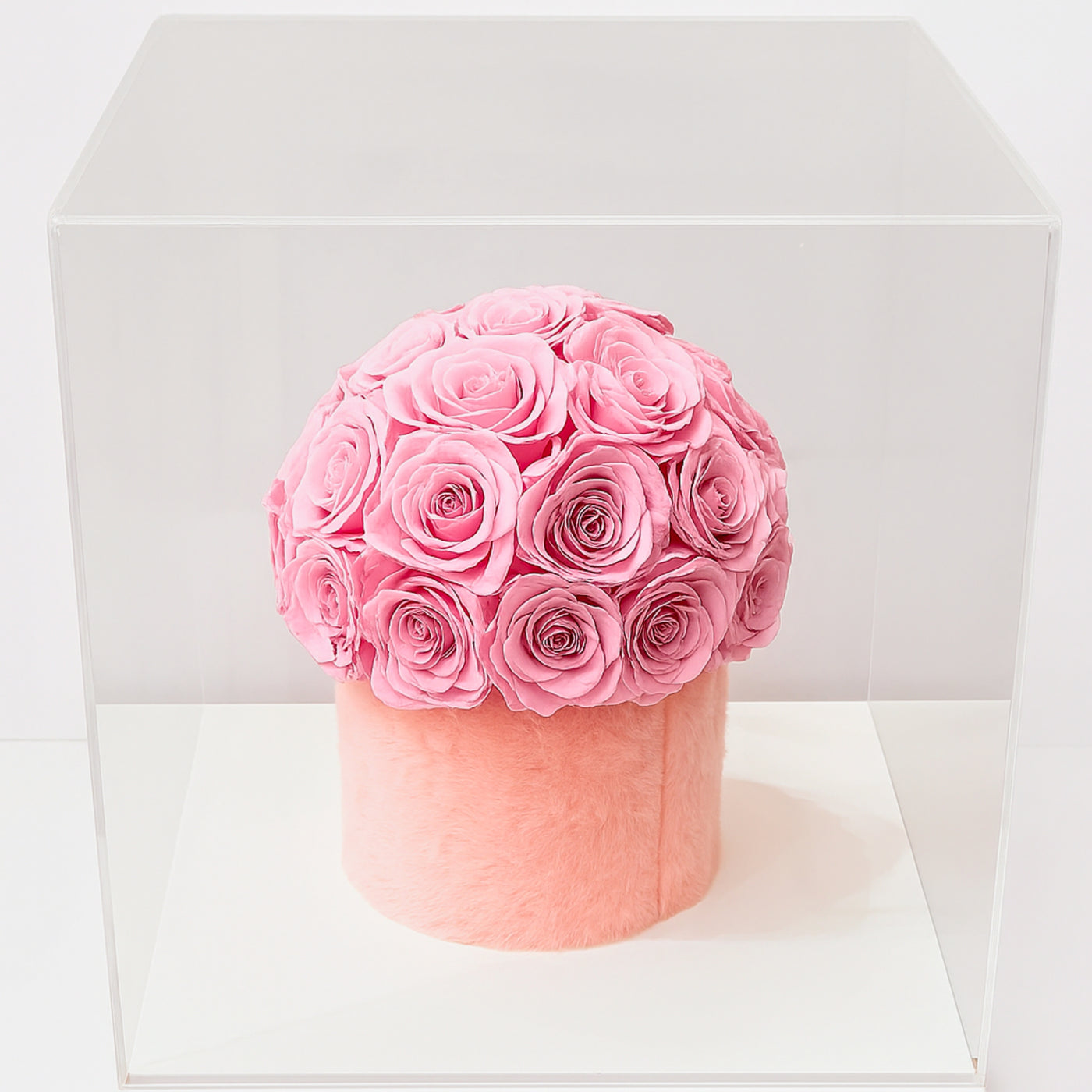 Indulge in timeless luxury with We Flowers’ Big Pink Infinity Rose Arrangement, a stunning display of everlasting beauty and sophistication. Crafted with precision by We Flowers, this preserved bouquet features lush, soft pink roses elegantly arranged in a plush velvet base and encased within a crystal-clear acrylic box. Each petal radiates elegance, capturing the essence of romance, femininity, and grace.